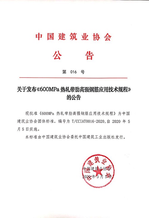 關(guān)于發(fā)布《600MPa熱軋帶肋高強(qiáng)鋼筋應(yīng)用技術(shù)規(guī)程》的公告