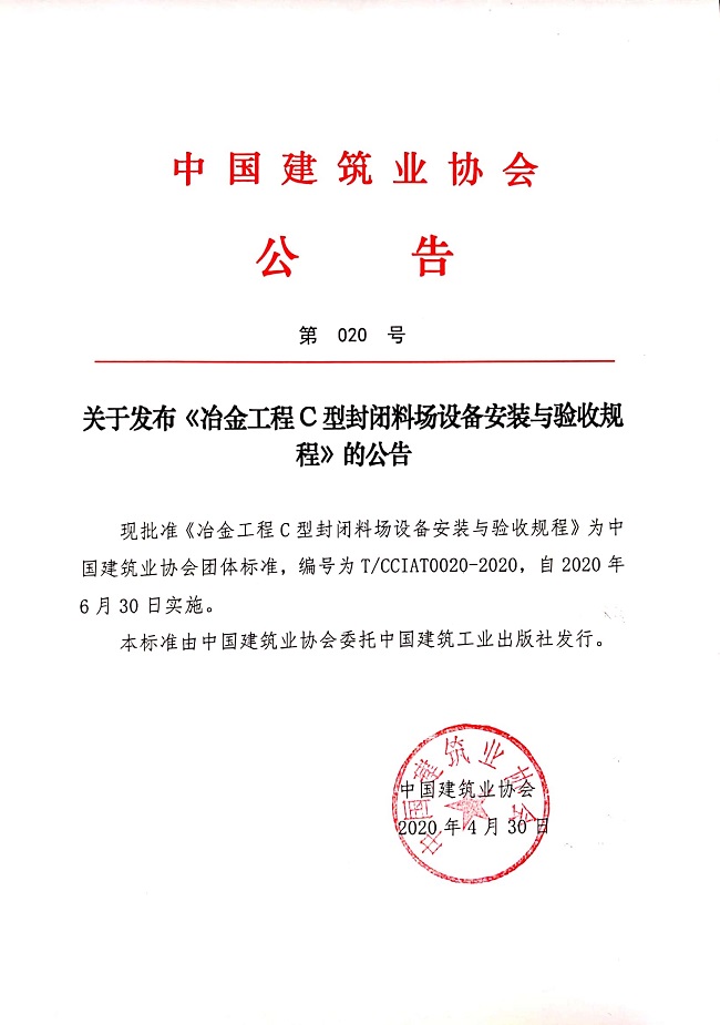 關于發布《冶金工程C型封閉料場設備安裝與驗收規程》的公告