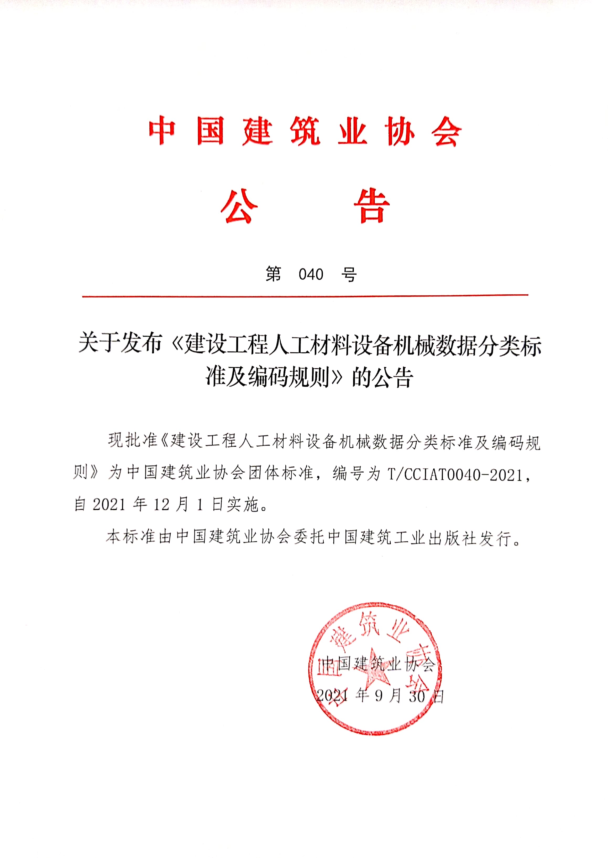 關于發布《建設工程人工材料設備機械數據分類標準及編碼規則》的公告