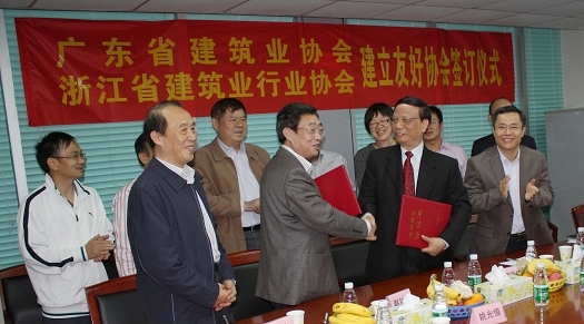 11月10日,浙江省建筑業行業協會趙如龍會長、姚光恒副會長兼秘書長等一行四人到達廣州,與廣東省建筑業協會舉行建立友好協會的簽訂儀式,廣東省建筑業協會李福偉會長、梁劍明秘書長等出席簽訂儀式,兩省協會的現任副會長單位中天建設集團有限公司的駐廣東負責人應邀參加了會議。雙方對協會機構設置、協會工作、兩省建筑業發展情況和前景趨勢等方面進行了交流。李福偉會長和趙如龍會長分別代表廣東省和浙江省建協在友好協會協議上簽字,雙方互贈紀念品并合影留念。