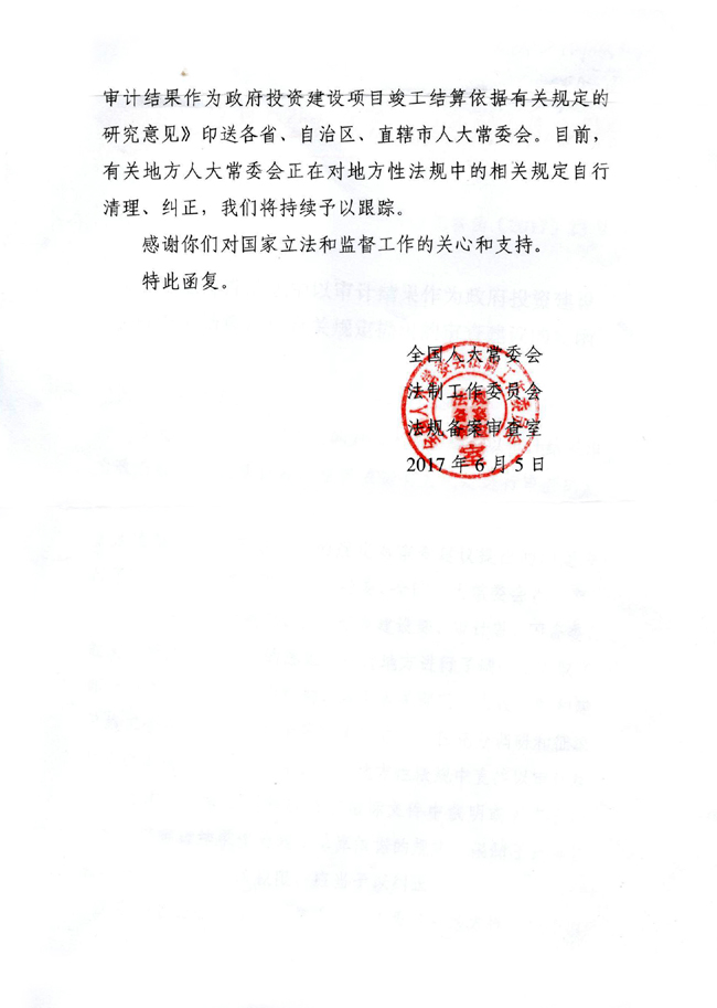 6月5日,我會收到法工委《關(guān)于對地方性法規(guī)中以審計結(jié)果作為政府投資建設(shè)項目竣工結(jié)算依據(jù)有關(guān)規(guī)定提出的審查建議的復(fù)函》。《復(fù)函》提出,在收到我會于2015年5月提交的《關(guān)于申請對規(guī)定“以審計結(jié)果作為建設(shè)工程竣工結(jié)算依據(jù)”的地方性法規(guī)進行立法審查的函》后,法工委經(jīng)過充分調(diào)研和征求意見,認為地方性法規(guī)中直接以審計結(jié)果作為竣工結(jié)算依據(jù)和應(yīng)當在招標文件中載明或者在合同中約定以審計結(jié)果作為竣工結(jié)算依據(jù)的規(guī)定,限制了民事權(quán)利,超越了地方立法權(quán)限,應(yīng)當予以糾正。2月22日,法工委印發(fā)《對地方性法規(guī)中以審計結(jié)果作為政府投資建設(shè)項目竣工結(jié)算依據(jù)有關(guān)規(guī)定的研究意見》,要求各省、自治區(qū)、直轄市人大常委會對所制定或者批準的與審計相關(guān)的地方性法規(guī)開展自查,對有關(guān)條款進行清理糾正。6月13日,應(yīng)法工委邀請,我會有關(guān)負責同志赴法工委辦公室聽取了此項工作的開展過程和最新進展情況,了解到各地現(xiàn)已完成自查,對相關(guān)條款的清理修訂工作亦在抓緊落實。