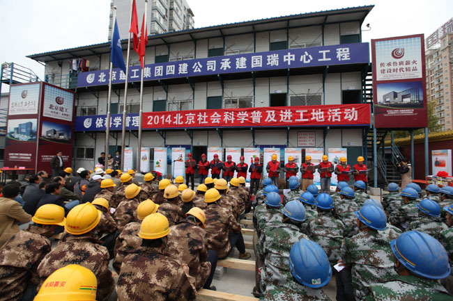 “我們要繼承老一輩為國家富強而奮斗終身的高尚情操和為國家無私奉獻的純潔情懷。愛崗敬業(yè),謹守誠信道德,堅決反對弄虛作假,大力營造善于合作、平等尊重、誠信為本、寬容待人的濃厚氛圍,誠實做人、守信做事。以高度的責任感和使命感,提高文化自覺,堅定文化自信,做培育和踐行社會主義核心價值觀的表率。”10月21日上午,在北京建工四建公司國瑞中心工地施工現(xiàn)場,來自該項目經(jīng)理部的代表付鵬面對百余名外來務(wù)工人員正式宣讀“弘揚中華傳統(tǒng)文化,培育和踐行社會主義核心價值觀倡議書”,這也是此次北京社科聯(lián)攜手北京建工四建公司開展2014社科普及周之——社科進工地活動內(nèi)容之一。北京市社科聯(lián)副巡視員王彥京、社科普及部主任張楠、北京建工集團副總經(jīng)理蘭慧賓、黨委常委宣傳部長俞振江,公司黨委書記張慶澤出席活動,活動由公司黨委副書記、工會主席劉春生主持。四建公司京內(nèi)各單位黨支部書記、團支部書記、公司總部相關(guān)部室負責人以及國瑞中心項目部管理人員和外施工人代表等200余人參加。