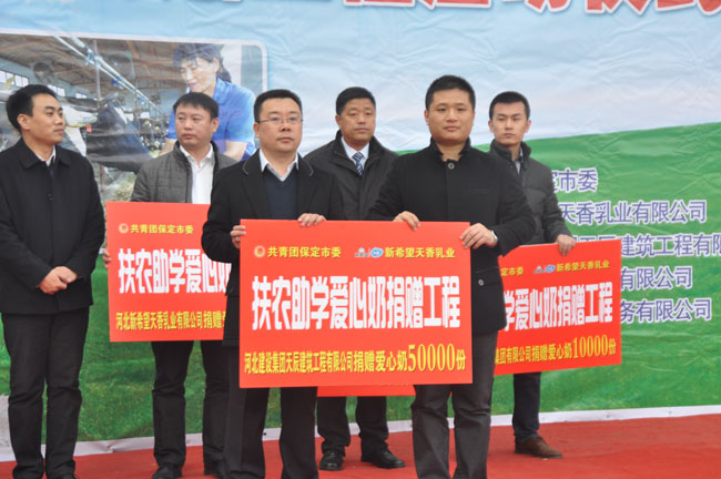 2015年1月18日,共青團(tuán)保定市委聯(lián)合河北新希望天香乳業(yè)有限公司組織的保定市“扶農(nóng)助學(xué)”愛心奶捐贈工程啟動儀式在市青少年宮舉行。此次活動上,河北建設(shè)集團(tuán)下屬的子公司——天辰公司熱心捐款5萬元購買愛心奶,在體現(xiàn)了高度的社會責(zé)任感的同時,又為奶農(nóng)和希望小學(xué)的孩子們送去社會的關(guān)懷和冬天的溫暖。