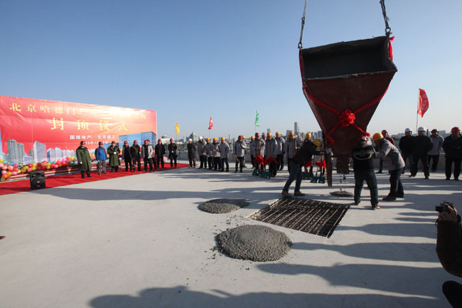 2015年12月3日上午10時18分,在繁華的崇文門商圈東南一角,一座宏偉大氣的高樓拔地而起,由北京國瑞地產開發、北京建工四建施工的北京哈德門廣場工程(東城區崇文門路口東南角0138-607地塊商業金融項目)澆筑了最后一斗混凝土,這標志著該工程主體結構全面封頂。