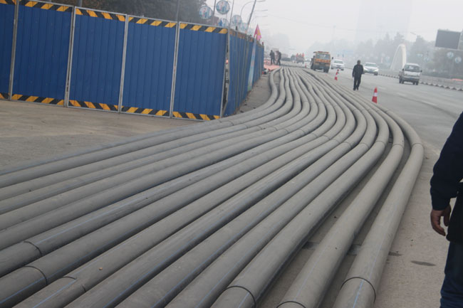 一切,是在街巷非開挖下實現的。沿保定市七一路來到與恒祥大街的交叉口附近,有一個完工的施工工作井。施工人員已將一組12根的PE管材,從百米外的另一個工作井,由地下拖引到這里。1米多深的井內,露頭的每根管材像胳膊一樣粗細,“在井口看,這組管線埋設不深,可地下最深處的有10多米。”安裝公司安全生產處處長王振東說,“管線從一個工作井進入,再到另一個工作井露出,在地下是呈‘U’形延伸的。”