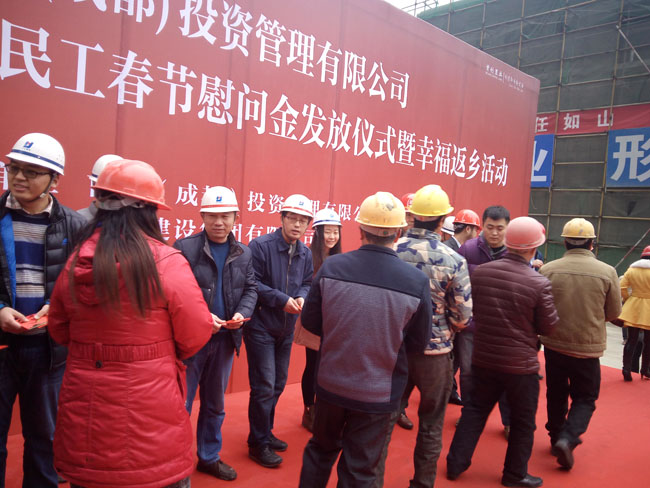 河北建設(shè)集團(tuán)成都分公司、首創(chuàng)(成都)投資管理有限公司等相關(guān)負(fù)責(zé)同志出席歡送儀式,共同表達(dá)對農(nóng)民工兄弟的感謝之情。他們親手為農(nóng)民工兄弟們包好過年的紅包,祝福他們新的一年紅紅火火,財(cái)源廣進(jìn)。該集團(tuán)首創(chuàng)嬌子一號(hào)項(xiàng)目部也不甘落后,出資租用了數(shù)輛大巴車護(hù)送農(nóng)民工兄弟安全返鄉(xiāng)。