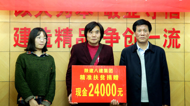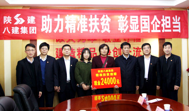 10月25日下午,陜建八建集團在西安舉行了“助力精準扶貧,彰顯國企擔當”捐贈儀式,集團黨委書記、董事長劉鵬慧代表企業為藍田縣輞川鎮七安子村貧困戶朱國亮捐贈了2.4萬元的危房改造資金 。西安市碑林區委宣傳部副部長、文明辦主任劉玉參加見證活動。