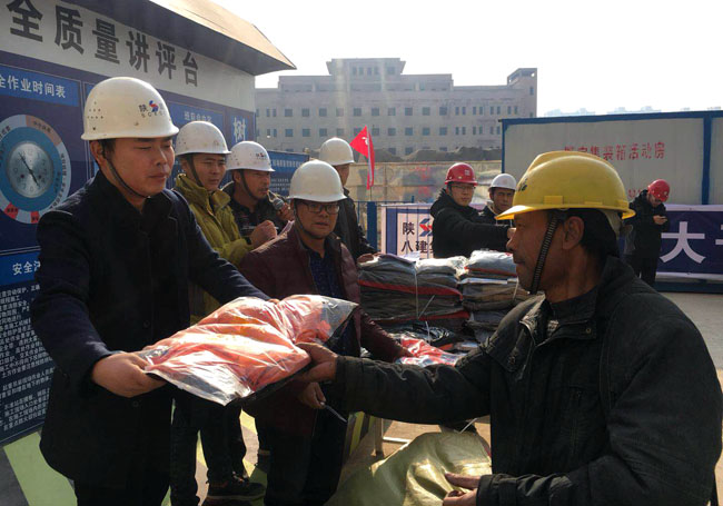 在蘭州,陜建八建集團中海項目部聯合建設方為一線工作人員和農民工發放了沖鋒衣、護手霜等御寒保暖用品。項目經理劉曉軍叮囑大家,冬季寒冷施工難度較大,一定要注意保暖,保重身體,牢固樹立安全意識,平平安安回家過新年。