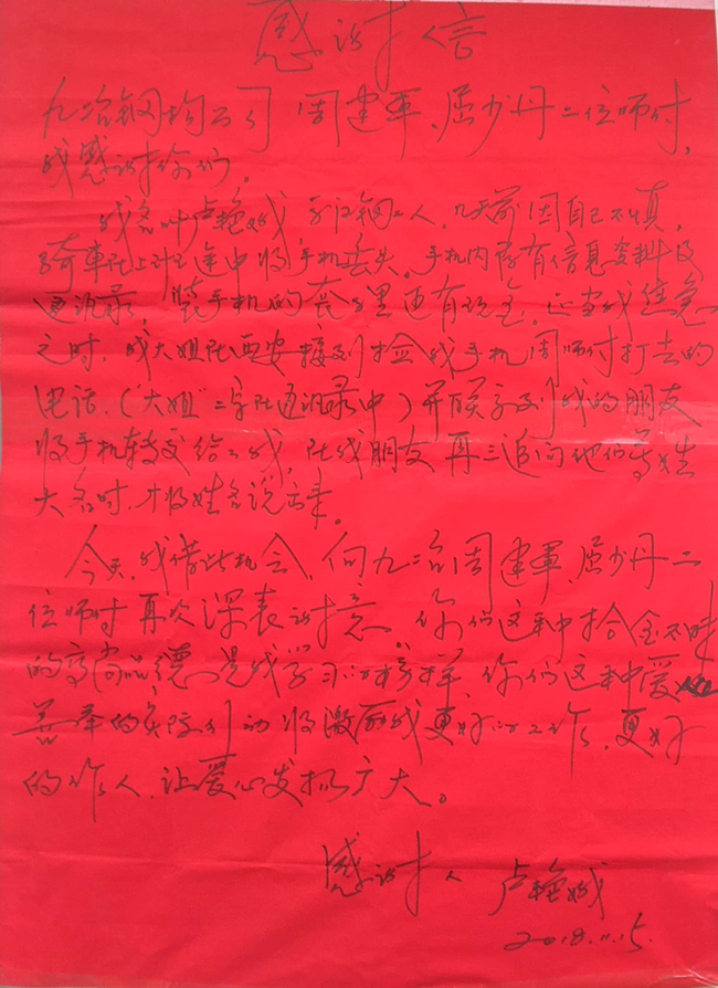 感謝信的作者系漢鋼工人盧艷娥。她幾天前在上班途中不慎將手機丟失,手機內存有信息資料及通訊錄,裝手機的套內還有現金。正當盧艷娥焦急之時,撿到手機的九冶漢中鋼構分公司鉚工班員工屈少丹和周建軍,通過盧艷娥的家人和朋友將手機送還給了她。