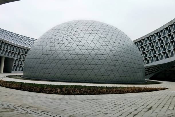 該項(xiàng)目造型獨(dú)特,鋼結(jié)構(gòu)包括主體結(jié)構(gòu)、表面斜交網(wǎng)格和球幕網(wǎng)殼,獨(dú)特的空間漸變曲面橢圓形屋蓋設(shè)計(jì),使科技館新館成為全國最大立面屋面雙向斜交網(wǎng)殼曲面結(jié)構(gòu)工程,在業(yè)界素有“小鳥巢”之稱。