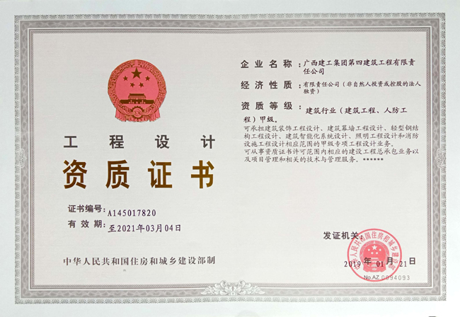 1月24日,廣西建工集團(tuán)第四建筑工程有限責(zé)任公司捧回了建筑工程施工總承包特級(jí)資質(zhì)和建筑行業(yè)(建筑工程、人防工程)兩項(xiàng)甲級(jí)設(shè)計(jì)資質(zhì)證書。這標(biāo)志著廣西建工四建取得了進(jìn)軍建筑工程高端市場(chǎng)的通行證,從此邁入了建筑施工行業(yè)“特級(jí)方陣”。