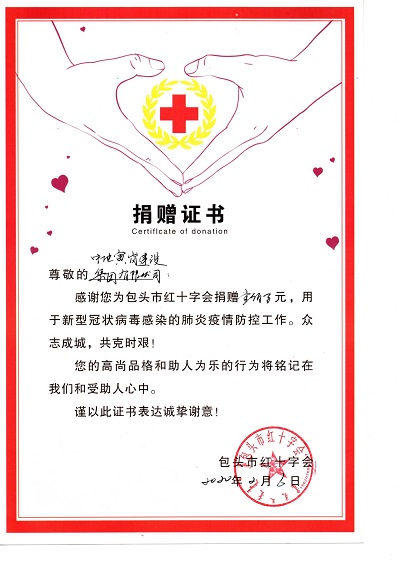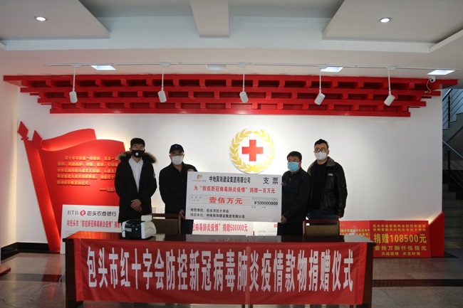 在做好集團員工自身防疫措施的同時,疫情面前集團公司勇于承擔社會責任。2月6日上午,中地寅崗建設集團有限公司啟動疫情防控愛心捐款行動,集團公司以董事長(總經理)郭志軒、副總經理劉峰、綜合部部長王琛熙為代表通過包頭市紅十字會向包頭市第一附屬醫院及湖北省紅十字會捐款人民幣共計100萬元,用于新冠病毒疫情防控工作。此次捐贈儀式在包頭市紅十字會救災備災中心舉行,紅十字會副會長王云峰及集團公司代表出席本次捐贈儀式。
