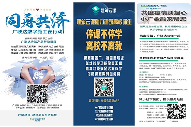 在防疫期間,廣聯達為企業提供移動辦公、項目資料管理、跨方協作、BIM成果應用,以及運行環境安全檢測、視頻會議系統、開放遠程任務及數據流轉統計、精品課程實訓等免費服務,幫助企業解決實際問題。幫助受疫情影響生產經營受困的小微企業,以提供信用貸款等多種形式,幫助企業減輕付款壓力、恢復生產運營。同時,推出復工政策、風險挑戰、專家連線、科技前瞻等多個“數字連線1+1”在線直播。