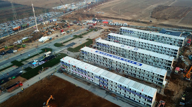 起步就是沖刺,開(kāi)局就是決戰(zhàn)。1月31日晚8點(diǎn),接到用10天時(shí)間建成西安市公共衛(wèi)生中心辦公生活區(qū)的命令,陜建集團(tuán)迅速成立了以張義光為總指揮的項(xiàng)目建設(shè)領(lǐng)導(dǎo)小組,連夜調(diào)派陜建機(jī)施集團(tuán)、一建集團(tuán)、產(chǎn)投集團(tuán)、物流公司、混凝土公司五家單位進(jìn)場(chǎng)。2月1日,2400余名施工人員和150多臺(tái)機(jī)械全部集結(jié)到位。2月2日,設(shè)計(jì)圖紙確定,項(xiàng)目大會(huì)戰(zhàn)正式打響。2月4日,僅用100個(gè)小時(shí)完成箱房首吊。2月6日,水塔鋼結(jié)構(gòu)支架安裝完成,化糞池安裝到位,室外停車場(chǎng)草皮磚鋪設(shè)完成,全部箱房吊裝完畢。2月9日晚十點(diǎn),經(jīng)過(guò)9天9夜、216個(gè)小時(shí)的不間斷鏖戰(zhàn),提前一天完成施工任務(wù)并交付使用。