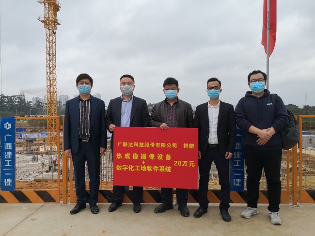 在廣西壯族自治區人民醫院邕武醫院平戰結合病房樓項目臨時黨支部揭牌儀式上,由廣聯達數字施工BG廣西公司總經理伍君先生代表廣聯達公司,向項目部捐贈了價值20萬元的熱成像攝像設備和數字化工地軟件系統,為疫情期間項目復工提供數字化管理與防疫保障,為堅守在抗擊疫情第一線的建設人員送去健康守護與關愛,與他們共同堅守“抗疫”戰爭一線。
