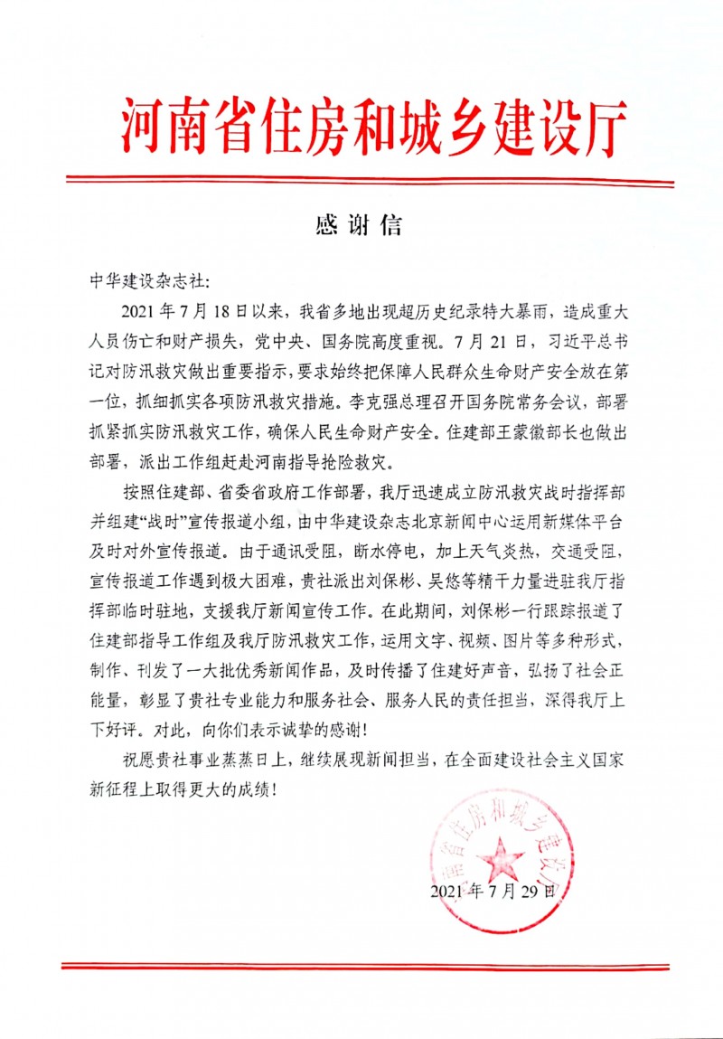 為此,7月30日,河南省住房和城鄉建設廳給《中華建設》雜志社發來《感謝信》,對《中華建設》在河南7.20防汛救災中展現的責任擔當予以高度好評,對所做的宣傳報道工作表示誠摯感謝。